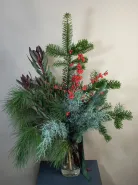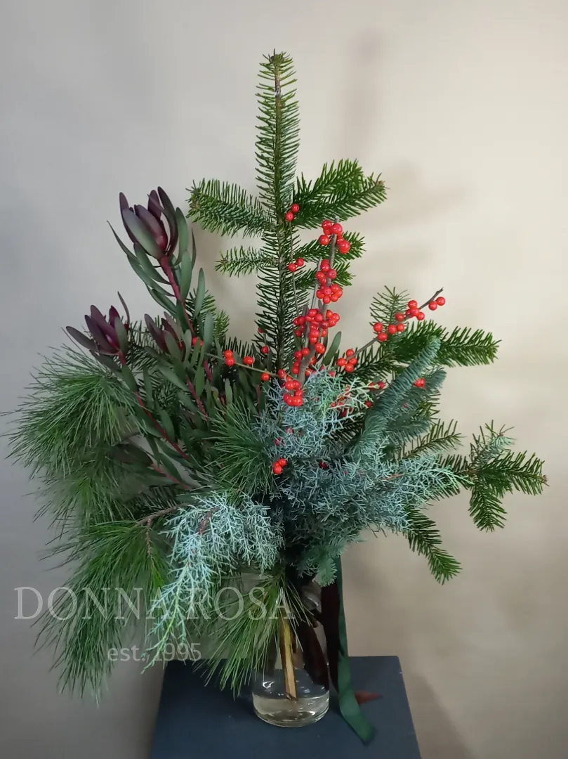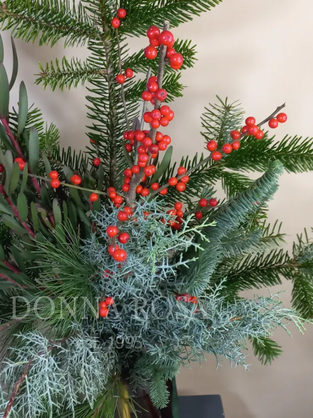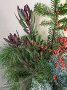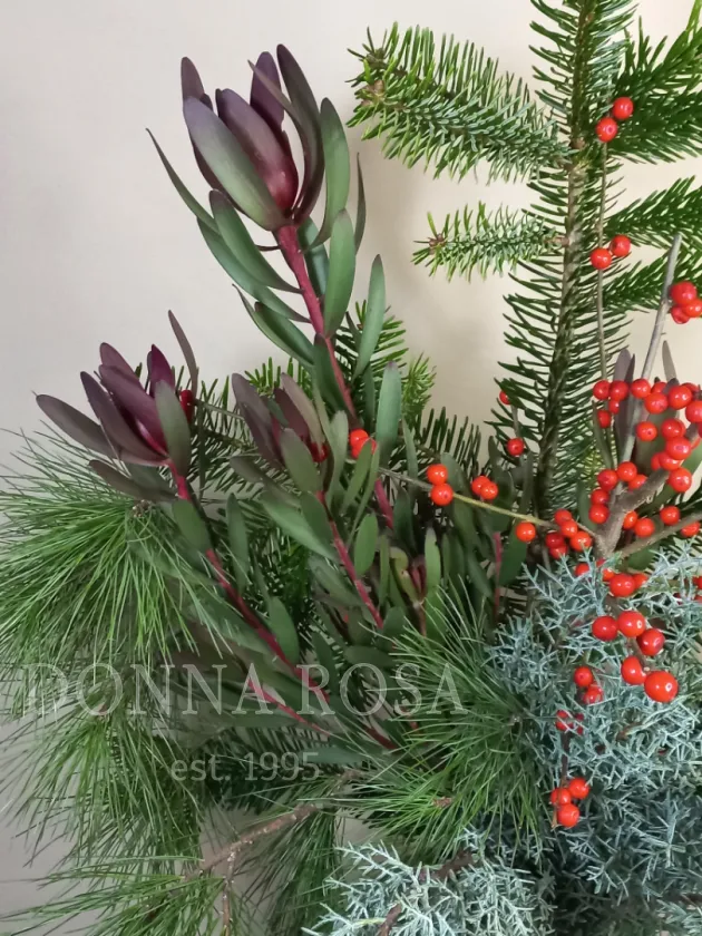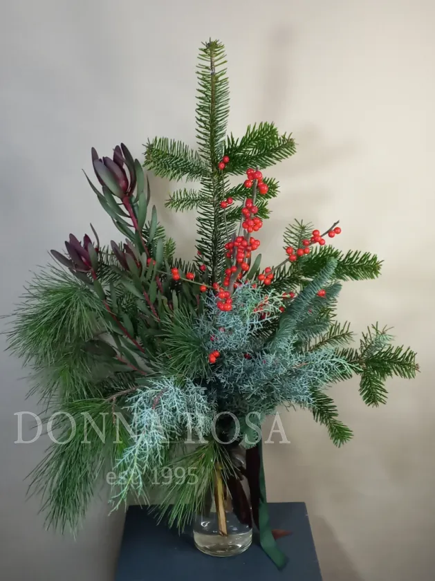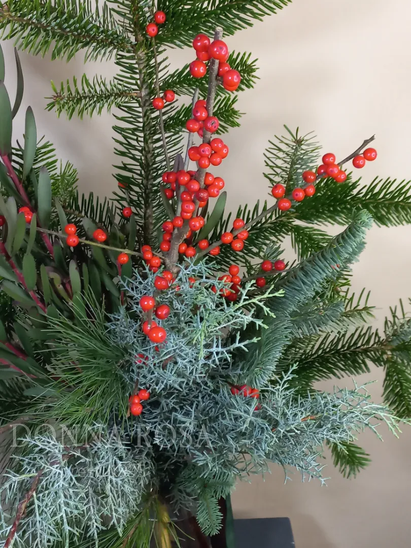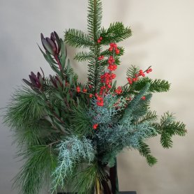 Погрузитесь в атмосферу зимней сказки. Этот букет, собранный из свежих и ароматных хвойных растений, подарит уют и тепло в холодное время года. В его состав входят элегантный Леукадендрон, нежный Нобилис, яркий Илекс и великолепный голубой Кипарис — каждое растение добавляет уникальности и гармонии. Букет отлично сохраняет свежесть на долгое время, радуя глаз и создавая атмосферу зимней красоты. Идеальный выбор для тех, кто ценит натуральность. Побалуйте себя или близких этим изысканным зимним подарком.