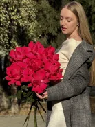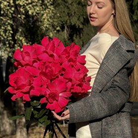 Букет из ярких розовых роз с роскошными бутонами и изумрудной зеленью станет прекрасным подарком для второй половинки, наполнит пространство любовью и нежностью. Он подойдет для выражения восхищения и благодарности, а также для романтического ужина или особого случая.