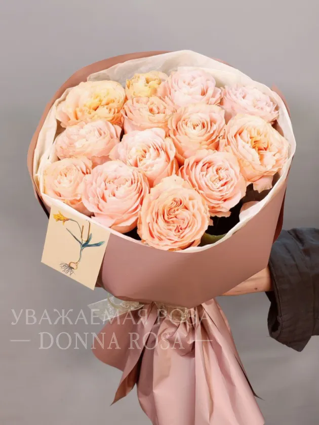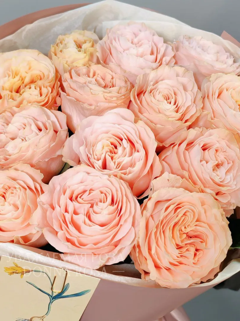 Букет из нежных роз персикового оттенка станет прекрасным подарком для тех, кто ценит элегантность и изысканность. Невероятная пышность и воздушность букета никого не оставят равнодушным. Розы, утопающие в нежных лепестках, наполнят любой интерьер теплом и уютом.