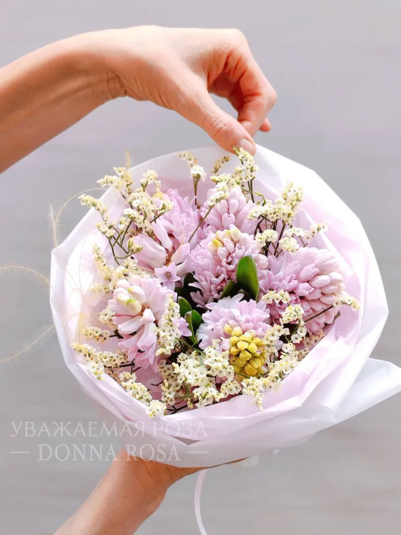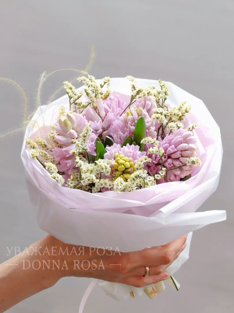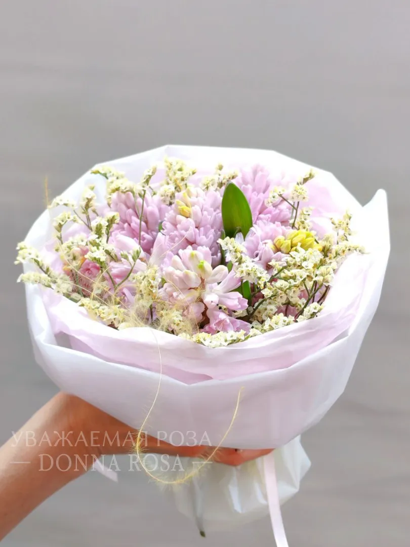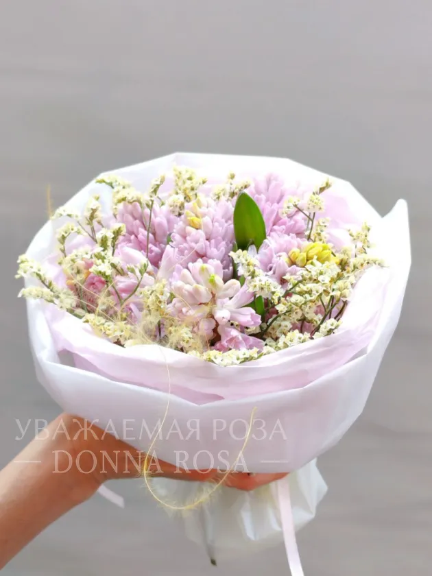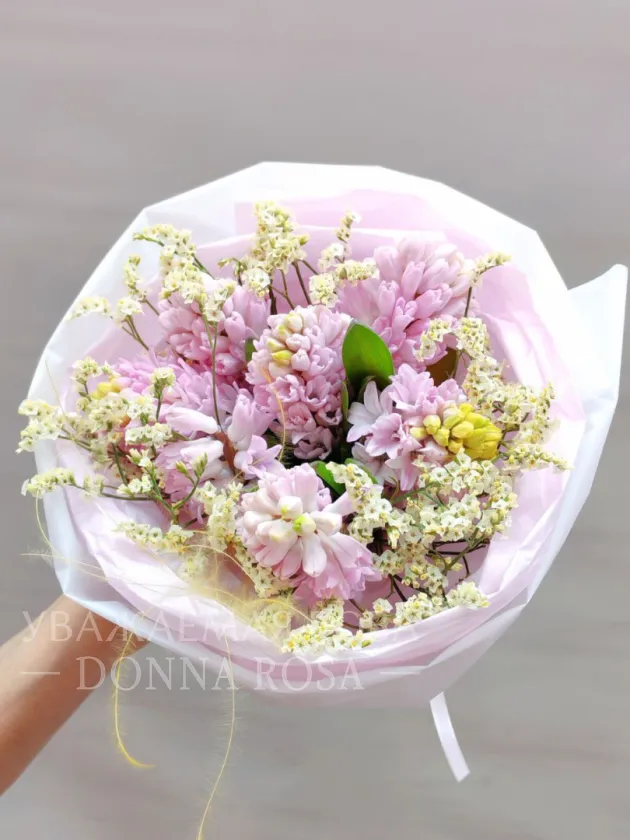 Букет из розовых гиацинтов и нежных белых соцветий смотрится воздушно и элегантно. Он наполнен свежестью и ароматом весны.Бледно-розовая упаковка добавляет образу легкость и трогательную нежность.