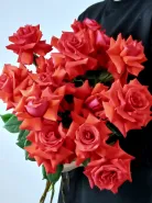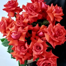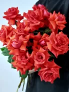 Букет из ярких коралловых роз. Создаёт атмосферу уюта и романтики. Великолепные цветы в сочетании с зелёной листвой выглядят элегантно и гармонично, делая композицию идеальной для любого торжества. Этот букет станет прекрасным подарком, выражающим любовь и признательность.