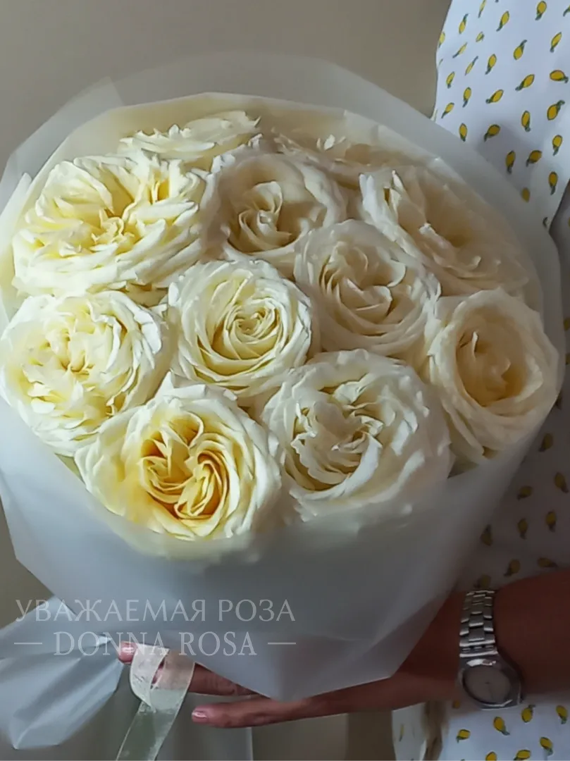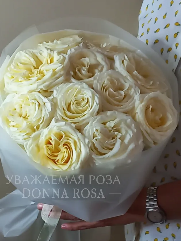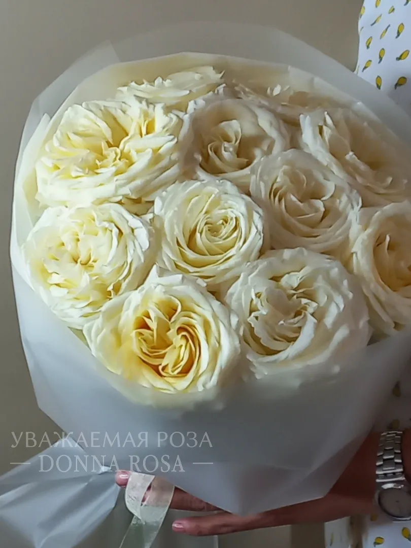 Описание букета Букет из нежных белых роз с кремовым оттенком, элегантно упакованный в матовую бумагу с атласной лентой. Эта композиция излучает чистоту и изящество, идеально подходя для любого торжественного случая.