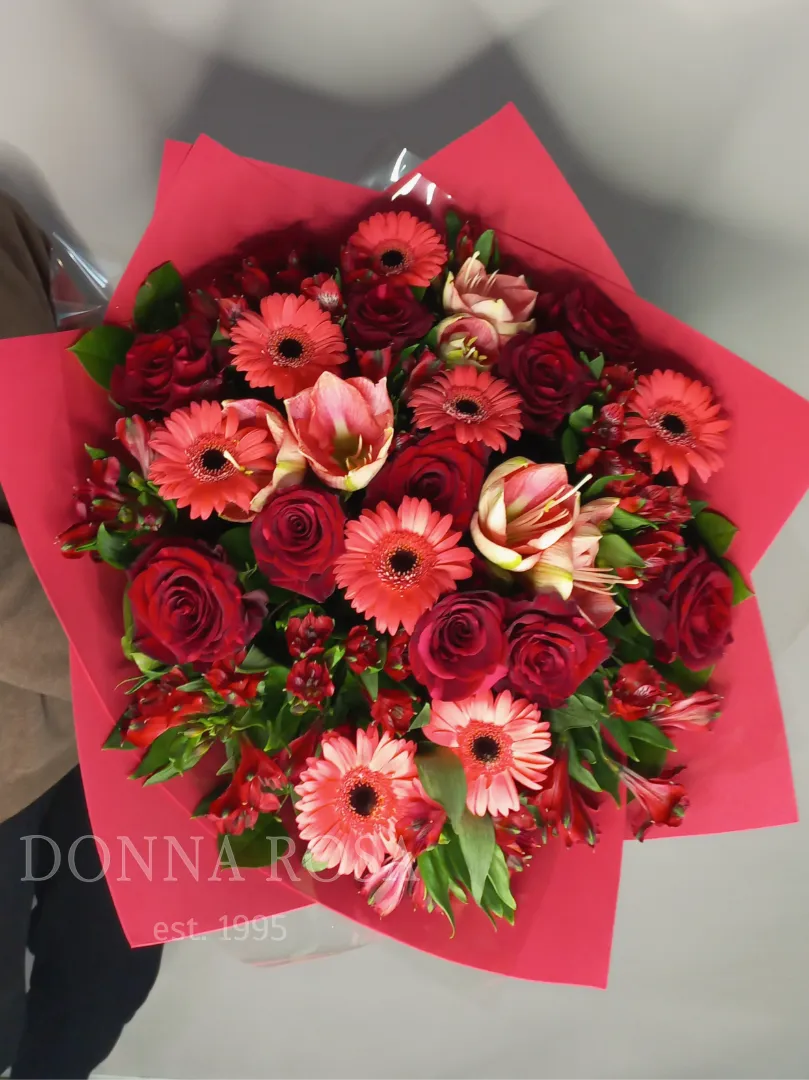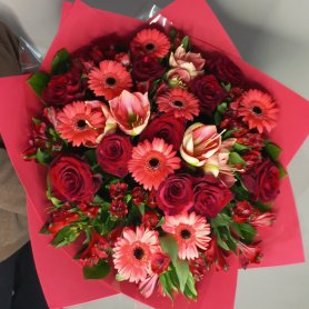 Букет из ярких красных роз и нежных розовых гербер, создаст романтичную и запоминающуюся атмосферу. Сочетание насыщенных и мягких оттенков делает композицию выразительной и гармоничной. Букет для торжественного повода.