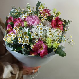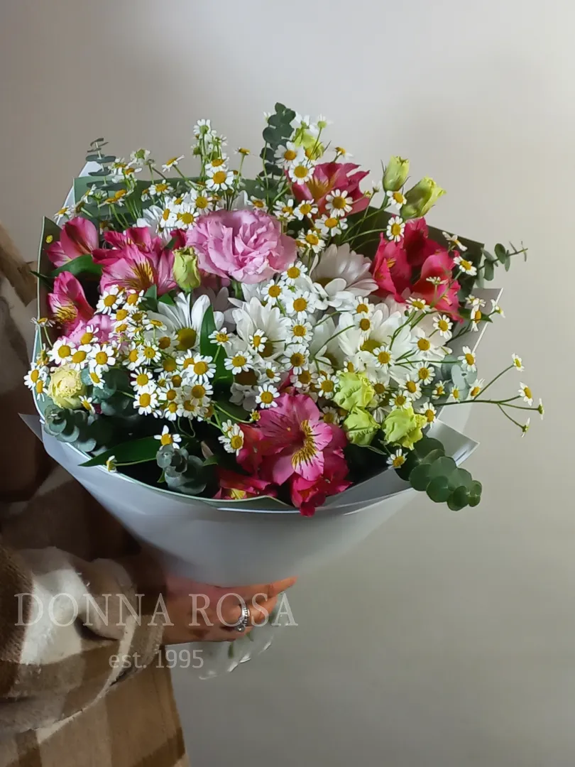 Букет представляет яркую и воздушную композицию из розовых альстромерий, кустовых ромашковых хризантем, матриакарии и лизиантуса. Нежные оттенки цветов в сочетании с веточками эвкалипта создают романтичный и трогательный образ. Этот букет станет прекрасным подарком для близких, наполняя пространство теплом и уютом.