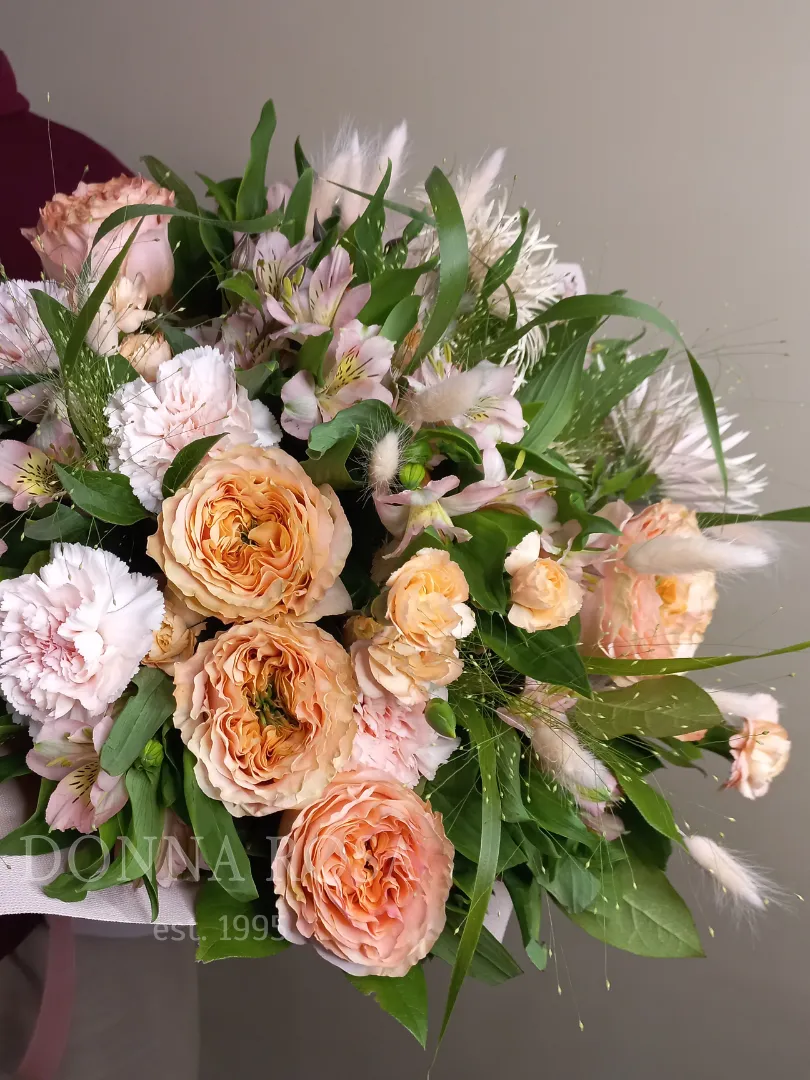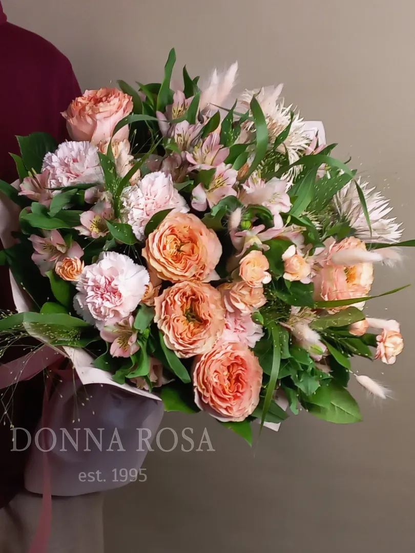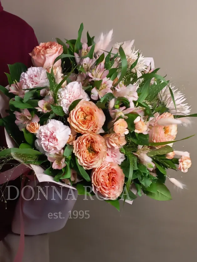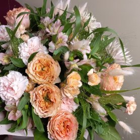 Букет представляет собой нежную композицию из персиковых роз, гвоздик и альстромерий, дополненную пышной зеленью. Нежные тона и разнообразие текстур создают легкий романтический образ, идеально подходящий для выражения тёплых чувств и эмоций. Этот букет станет прекрасным подарком для близких и дорогих людей.