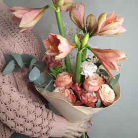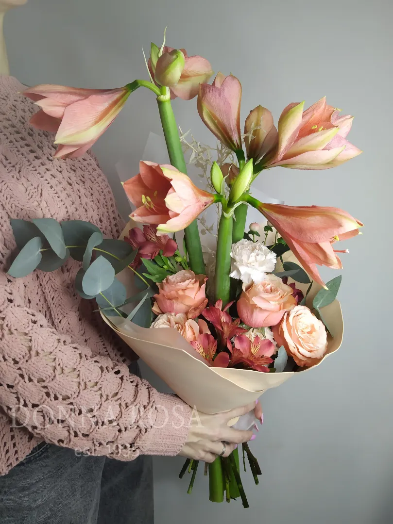 Букет из амариллисов, роз и альстромерий с добавлением эвкалипта - это нежное и элегантное сочетание, которое понравится ценителям изысканной красоты