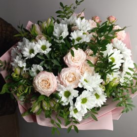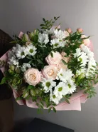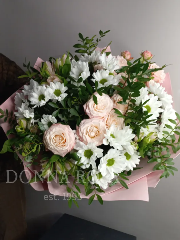 Букет из нежных белых ромашковых хризантем и бледно-розовых роз, дополненный свежими зелёными листьями.