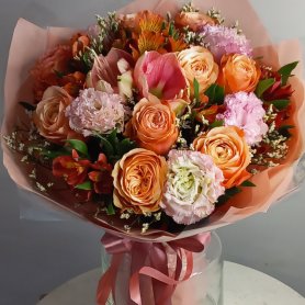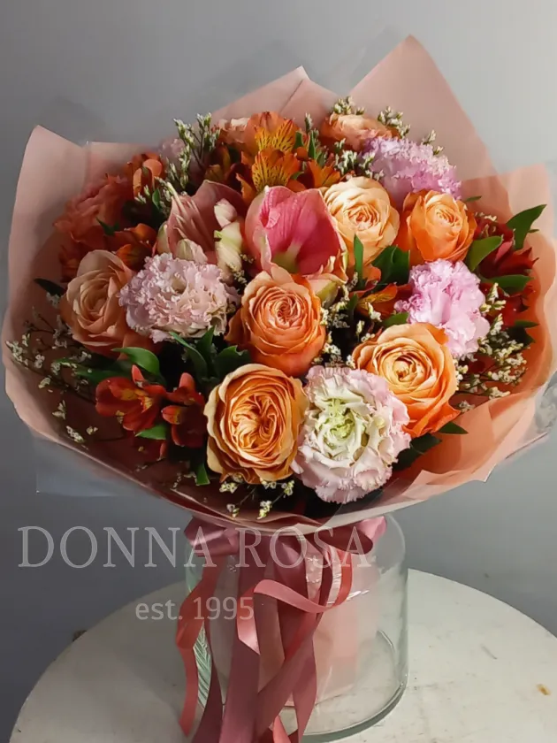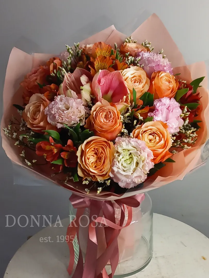 Яркое и одновременно нежное цветочное произведение, которое способно вызвать улыбку и радость у любого, кто его увидит. Композиция включает в себя разнообразные цветы тёплых оттенков: розы, эустомы, амарилис и альстремерии, которые гармонично сочетаются друг с другом, создавая ощущение тепла и уюта. Такой букет станет прекрасным подарком для близких или просто способом порадовать себя в обычный день.
