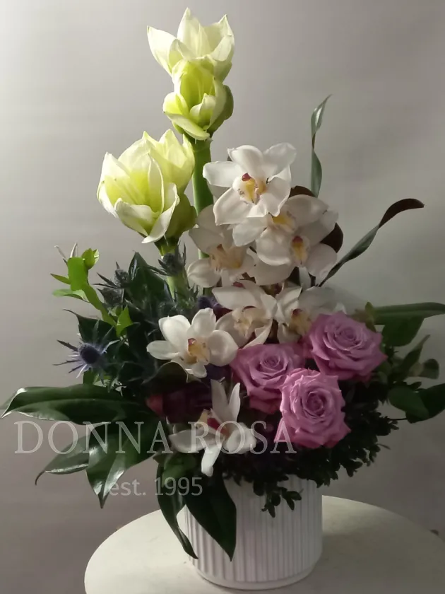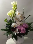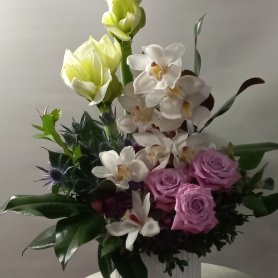 Элегантная композиция из нежных белых орхидей, амарилисов, роз и свежих зелёных листьев создавает гармоничное сочетание красоты и изящества. Композиция дополнена акцентными элементами, добавляющими объём и текстуру. Идеально подойдёт для любого торжественного случая.