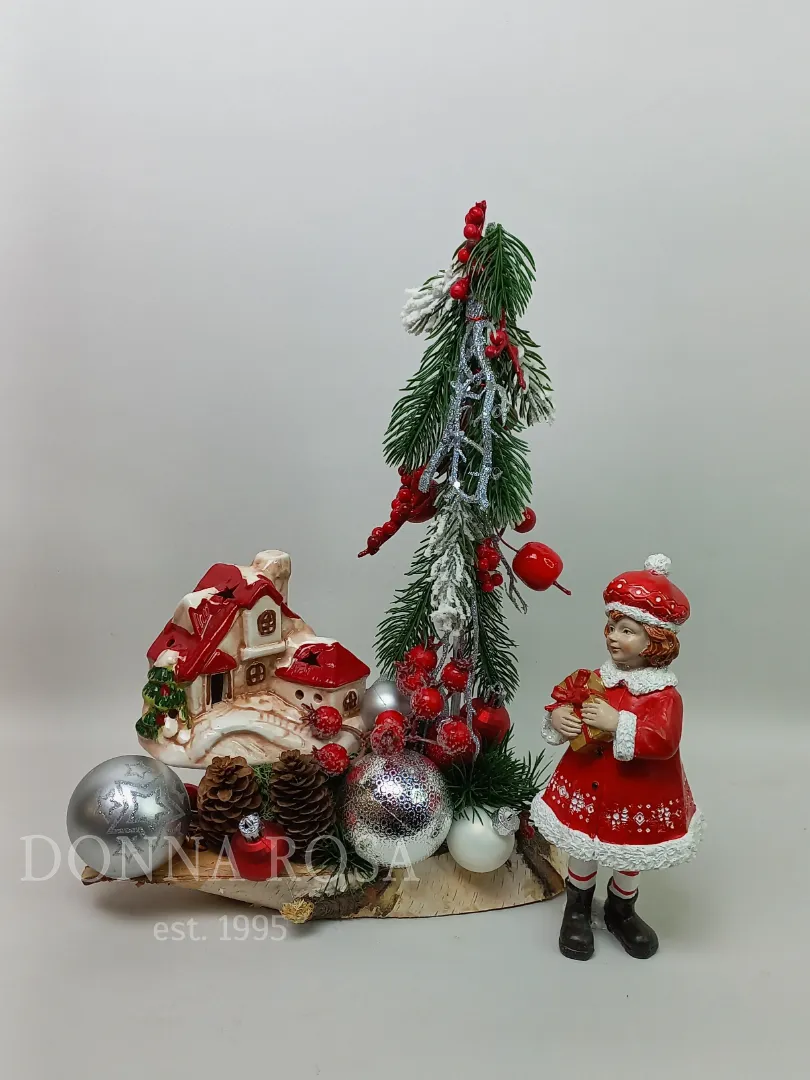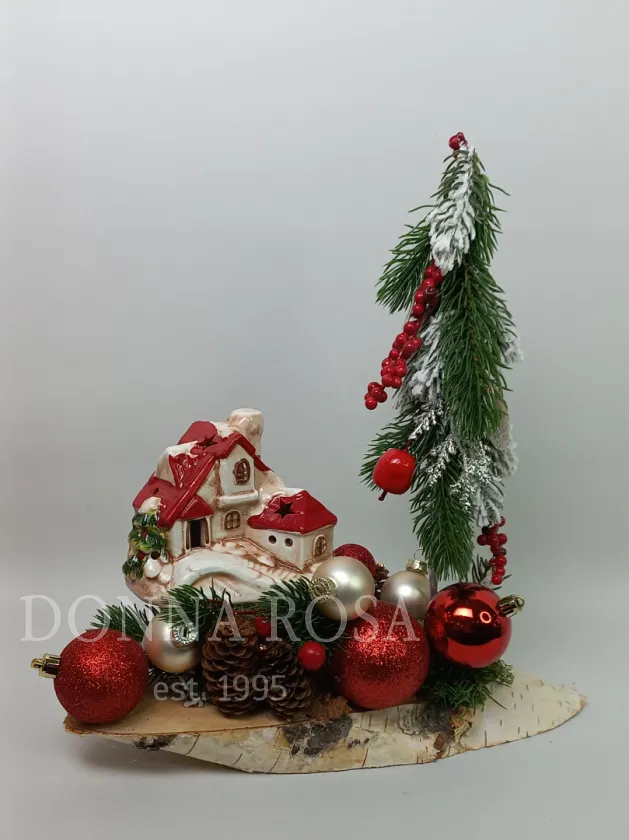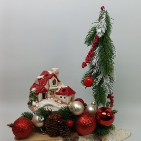 Зимняя композиция станет прекрасным украшением вашего дома в преддверии праздников. Композиция включает в себя миниатюрный керамический домик, , а также небольшую ёлочку, декорированную блестящими украшениями и красными ягодами. Вокруг расположены шишки, новогодние шары и другие праздничные элементы, создавая уютную и волшебную атмосферу.