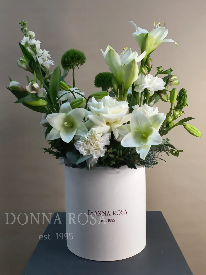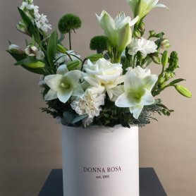 Подарите своим близким ощущение нежности и красоты с композицией «Нежная пора» в элегантной коробке. В его составе — изысканные белые лилии, розы, альстромерии и гвоздики, дополненные мягким ароматом эвкалипта и матиолы. Это композиция станет превосходным знаком внимания и трогательного сюрприза. Идеальное решение для любого торжества или просто, чтобы порадовать любимого человека.