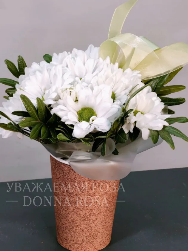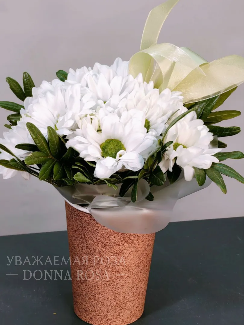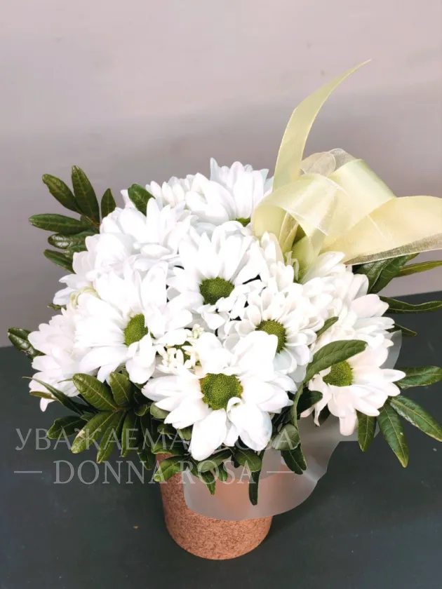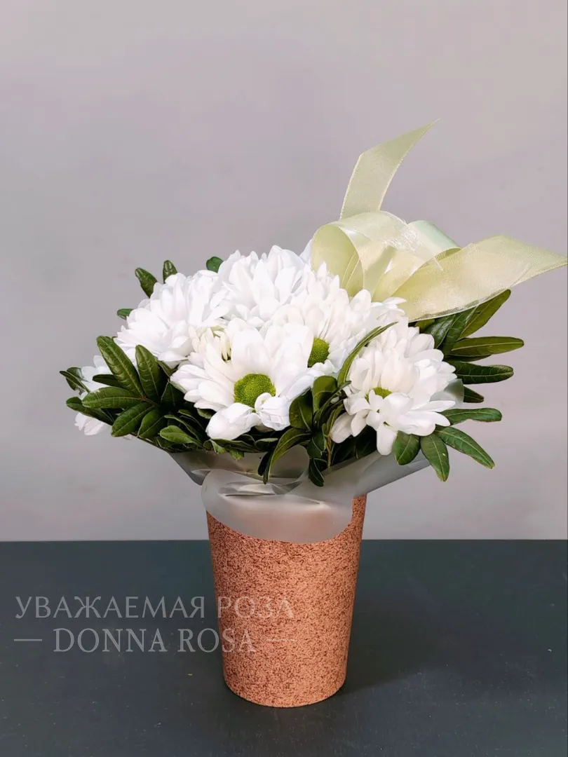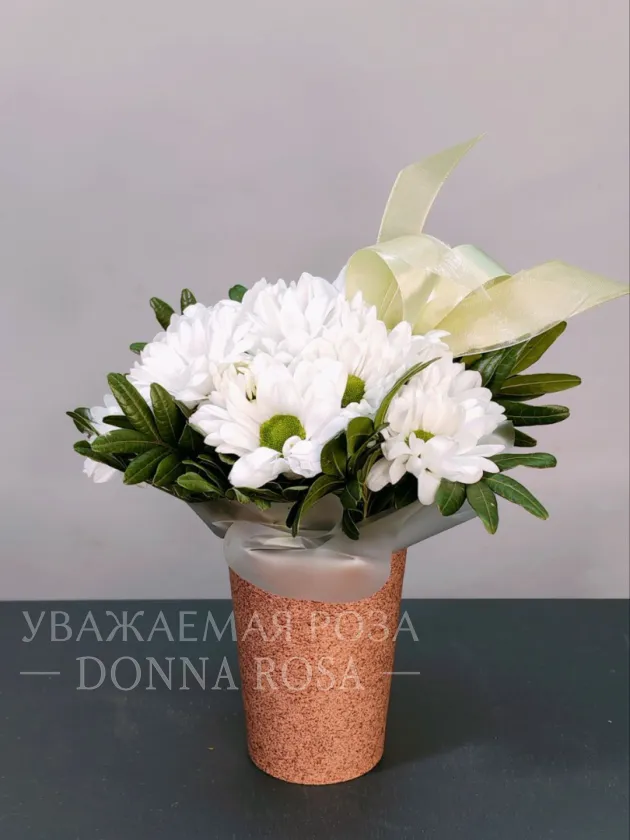 Нежный букет из белых хризантем, элегантно дополненный бледно-желтой лентой, создает атмосферу спокойствия и безмятежности. Композиция идеально подходит для выражения искренних чувств и эмоций. Хризантемы символизируют верность и долголетие, что делает их прекрасным выбором для любого торжественного случая.