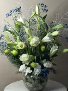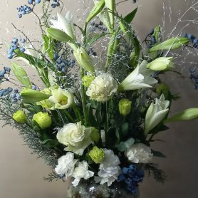 Подарите особое настроение с изысканной композицией «Зимние узоры», выполненной из свежих роз, лилий, гвоздик, эустом, ранункулюсов и украшенной изысканным декором. Элегантная ваза подчеркивает красоту каждого цветка и добавляет шарм вашему интерьеру. Идеальный выбор для любого праздника или для создания уюта в зимние дни.