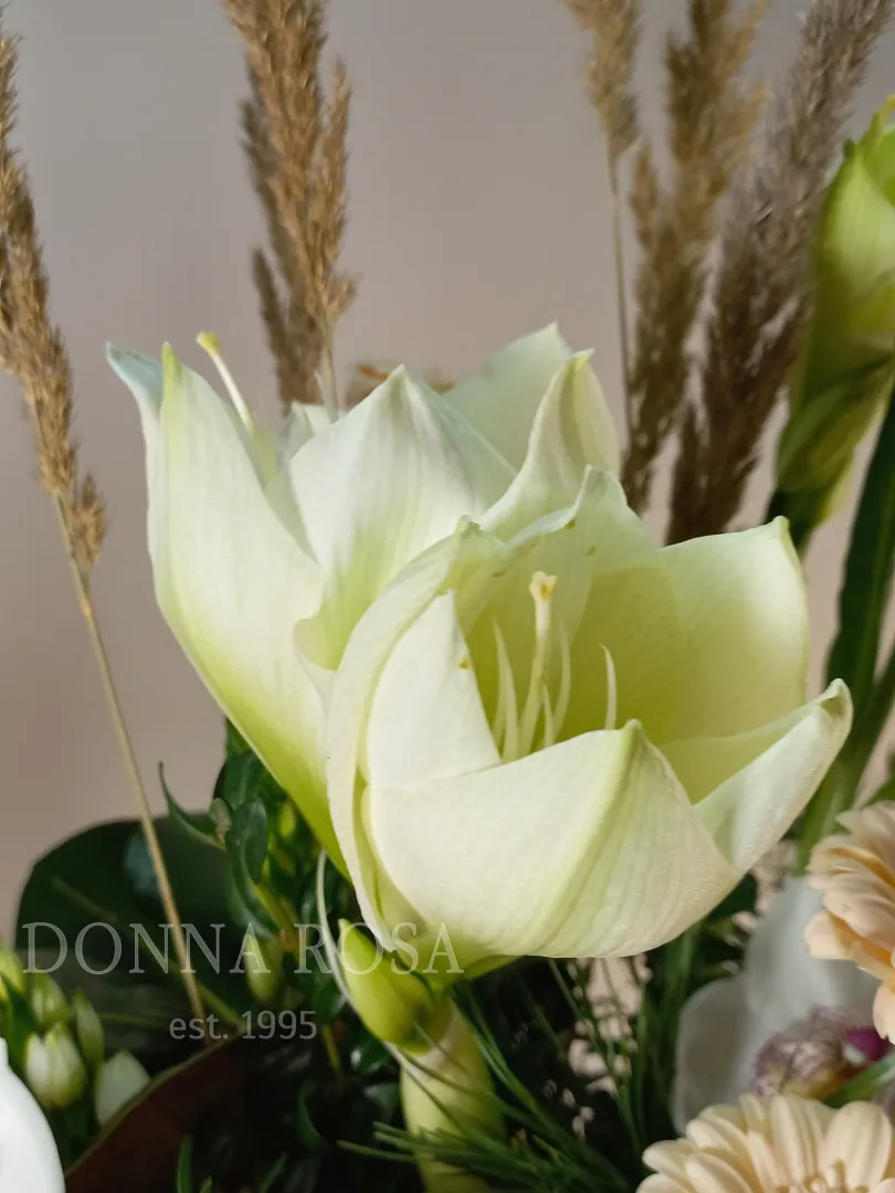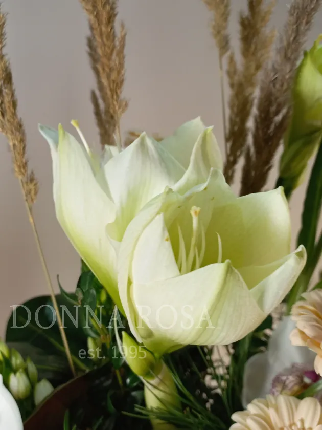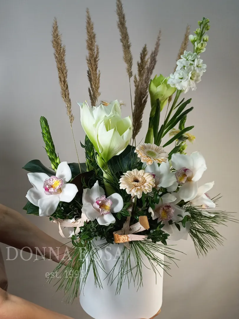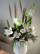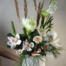 Букет-композиция в коробке «Благородство» украшен изысканными цветами, создавая атмосферу элегантности и утонченности. В его составе присутствуют изумительные лилии и пионовидная роза, амарилисы, добавляющие романтики и нежности. Голубой кипарис и эвкалипт создают свежий и природный акцент, а декоративные элементы подчеркивают уникальность оформления. Такой букет станет прекрасным подарком для ценителей красоты и стиля.