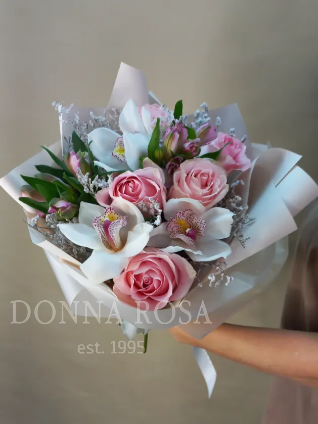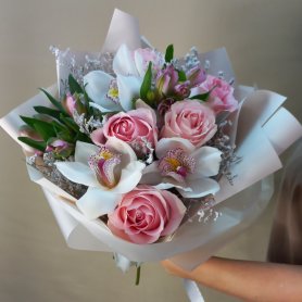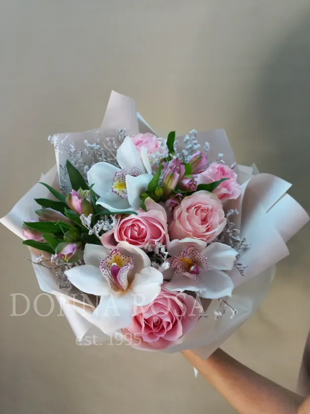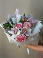 В состав букета входят нежные розы, которые придают ему романтический и элегантный вид. Также в композицию включены изящные орхидеи, добавляющие нотки утонченности и тропической свежести. Альстромерия завершает букет, создавая ощущение легкости и воздушности.