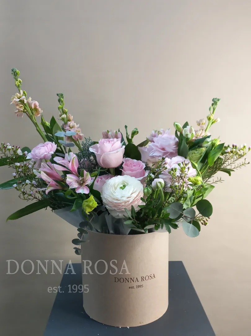 Композиция «Красота в простоте» представлена в стильной коробке, гармонично сочетающейся с изысканным оформлением. В составе использованы нежные и свежие эвкалипты, придающие композиции легкий аромат и зелень. Ваксфлауэр добавляет структуру и уникальность, делая букет более объемным. Альстромерии выделяются своей элегантностью, привлекая внимание своей необычной формой. Розы в композиции символизируют любовь и нежность, создавая романтическую атмос. Ранункулюсы добавляют нотки утонченности и экзотики.