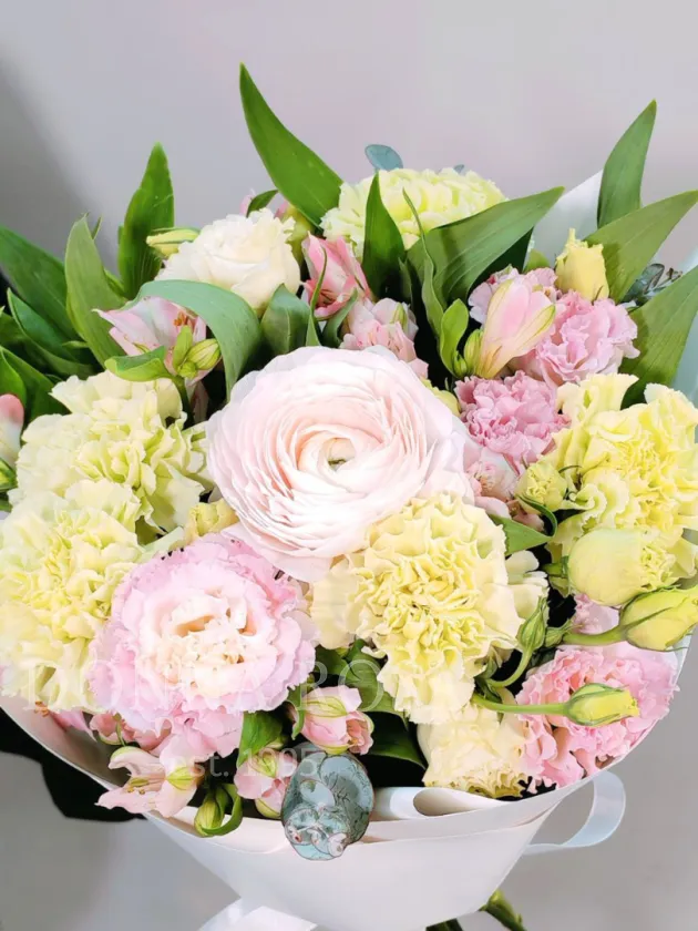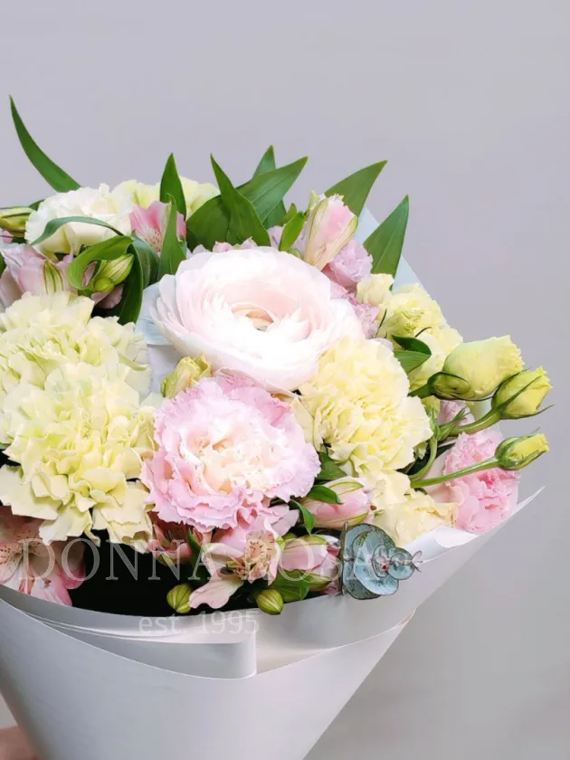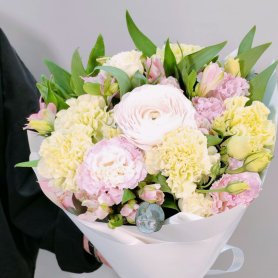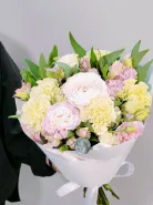 Букет в нежных оттенках белого и розового цветов создает элегантную и романтичную композицию. Нежная цветовая палитра и разнообразие текстур делают букет особенно привлекательным и идеально подходящим для выражения чувств. Букет, завёрнутый в белую бумагу, выглядит изящно и утончённо.