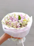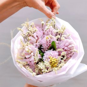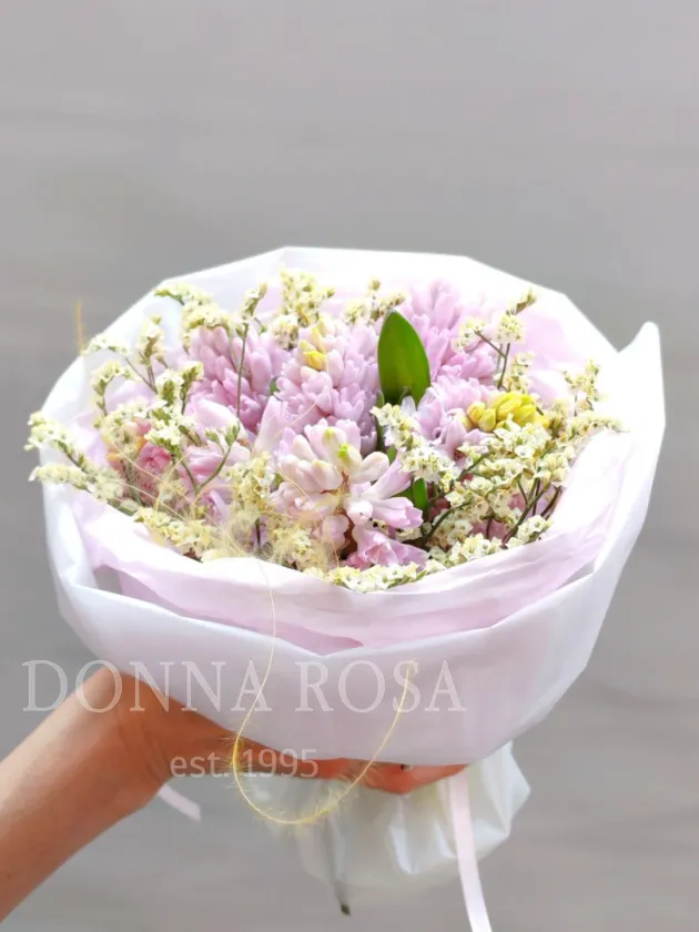 Букет из розовых гиацинтов и нежных белых соцветий смотрится воздушно и элегантно. Он наполнен свежестью и ароматом весны.Бледно-розовая упаковка добавляет образу легкость и трогательную нежность.