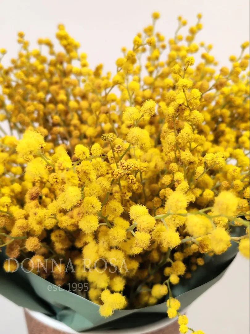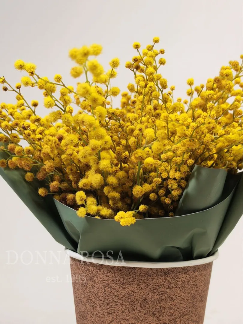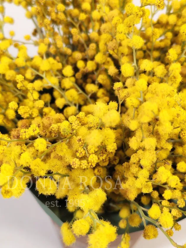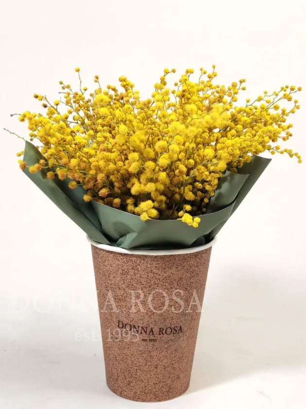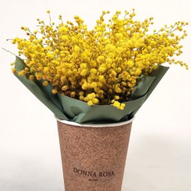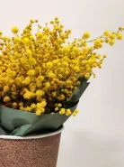 Букет из мимозы в изящной упаковке, символизирующий яркость и нежность. Солнечные соцветия наполняют композицию теплом и радостью, создавая праздничное настроение.