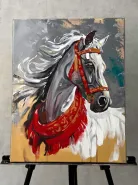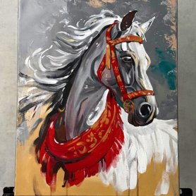 Изящное произведение искусства, которое станет ярким украшением вашего интерьера. Эта красивая и выразительная работа подчеркнет ваш стиль и добавит особое настроение вашему интерьеру. Палитра картины богата и разнообразна, сочетая глубокие серые и белые тона с яркими всплесками красного и золота. Лошадь изображена в ярком контрасте с фоном, что подчеркивает ее величественность и красоту. Несмотря на некоторую абстрактность, изображение лошади остается реалистичным и наполненным эмоциями.