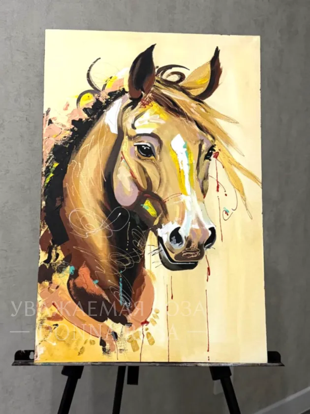 Картина, наполненная глубоким символизмом и яркими красками. На полотне изображён взгляд лошади, полный загадочности и внутренней силы, а акцент на глаза животного передает глубокие эмоции и характер персонажа. Выразительные мазки и насыщенная цветовая гамма придают работе особую экспрессию и динамику, делая её выразительным элементом интерьера.