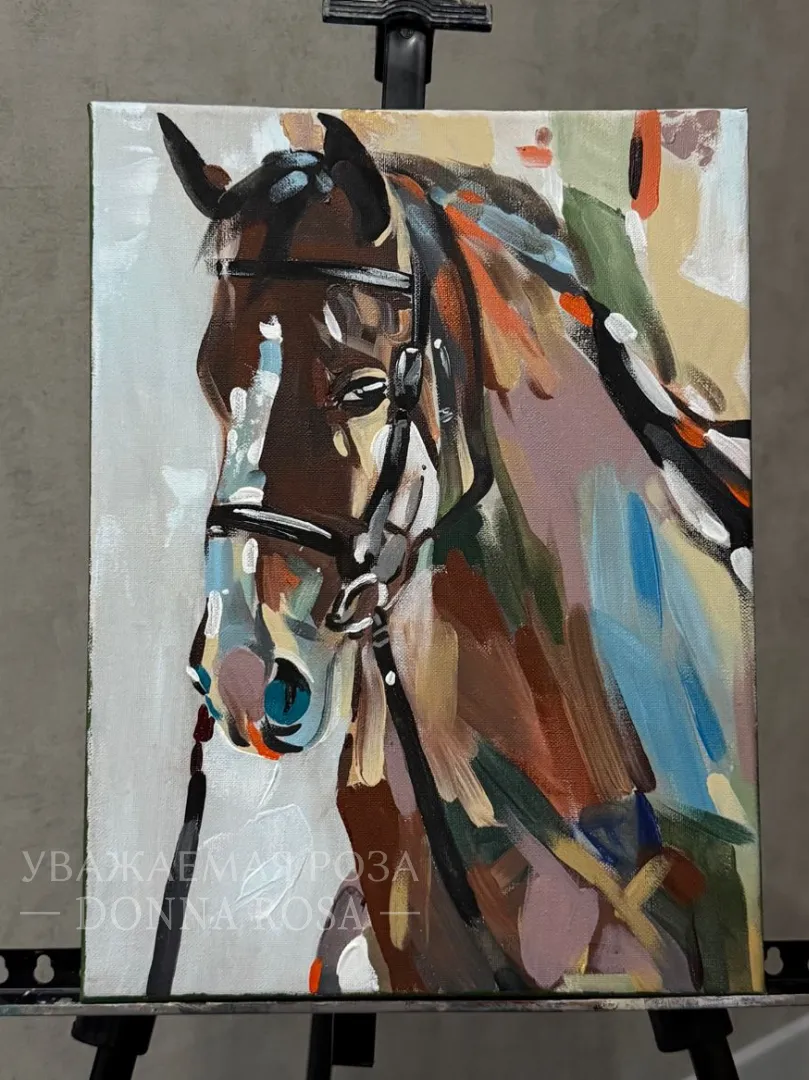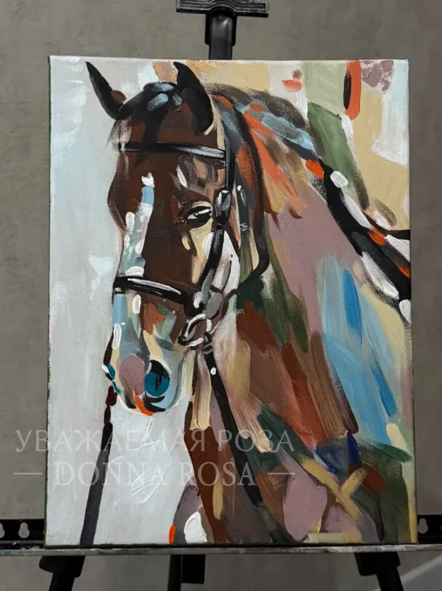 Абстрактный портрет лошади, полный динамики и энергии. Мазки художника оживляют благородное животное, захватывая его красоту и силу.