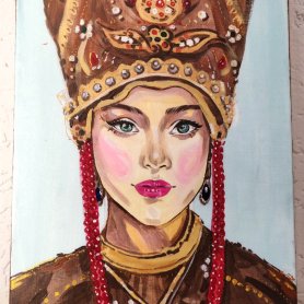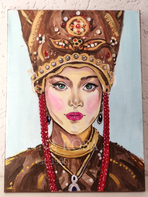 Портрет русской красавицы в традиционном убранстве. Изящное изображение, полное достоинства и изящества, привлекает внимание яркими красками и детализированным исполнением. Этот портрет станет настоящим украшением любого интерьера.