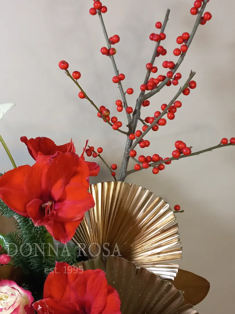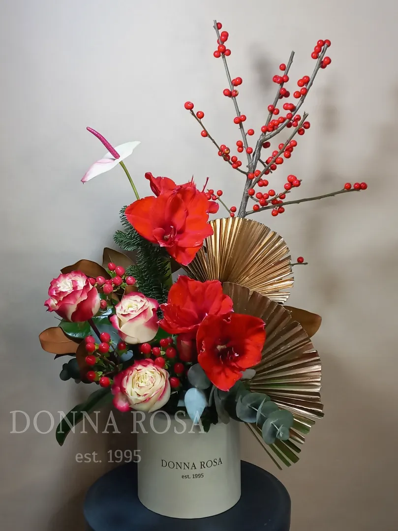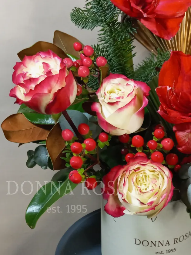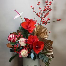 Порадуйте своих близких изысканной новогодней композицией «Зимнее кружево». В этом уникальном букете гармонично сочетаются свежие цветы и зимние акценты, создавая атмосферу тепла и уюта. В состав входит элегантный Нобилис, изысканная Магнолия и яркий Гиперикум, которые добавляют яркости и живости. Розы и Амариллис придают композиции роскошь и праздничное ощущение. Илекс и Эвкалипт создают насыщенную текстуру и аромат, наполняя пространство свежестью. Каждая веточка тщательно подобрана, чтобы подчеркнуть зимнюю красоту и уютный праздничный настрой. Эта композиция отлично украсит интерьер дома или офиса, наполняя его праздничной атмосферой. Идеальный подарок для тех, кто ценит стиль и элегантность.