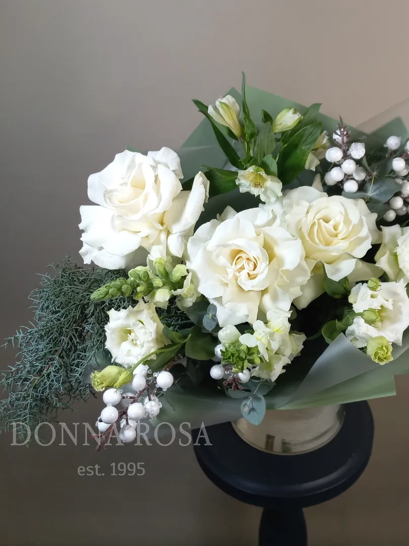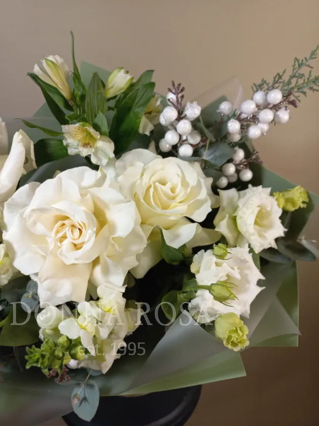 Букет из свежих белых роз, дополненный натуральной зеленью и декоративными ягодами. Олицетворение чистоты и элегантности. Нежные оттенки и воздушная структура цветов придают композиции легкость и романтичность. Идеальный выбор для тех, кто ценит сдержанную красоту и выразительность.