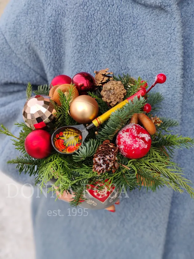 Эксклюзивная ручная работа с добавлением декоративных элементов создает праздничное настроение и идеально подходит для украшения интерьера в период зимних праздников. Эта композиция станет прекрасным дополнением к вашему новогоднему декору.