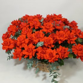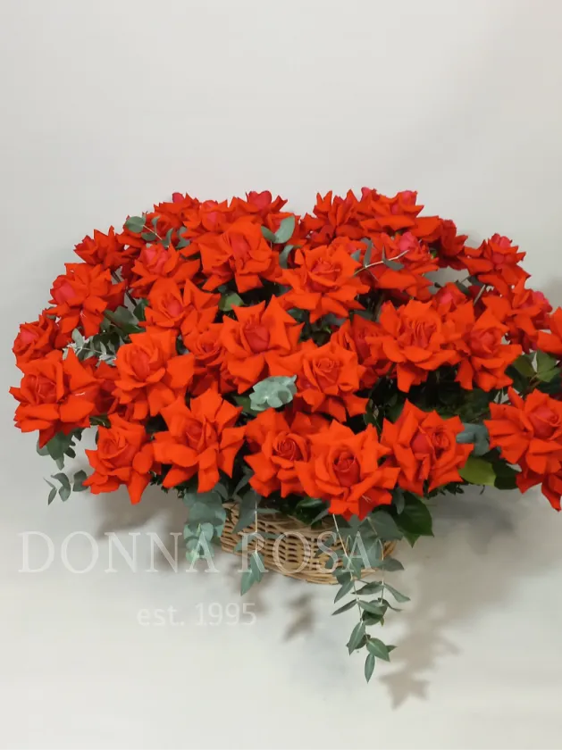Композиция из роз насыщенного алого цвета, дополненная эвкалиптом станет ярким акцентом в интерьере и подарком для близких. Розы в корзинке идеально подойдут для романтического свидания или в качестве признания в любви. Такой подарок точно не останется без внимания и принесет только положительные эмоции.